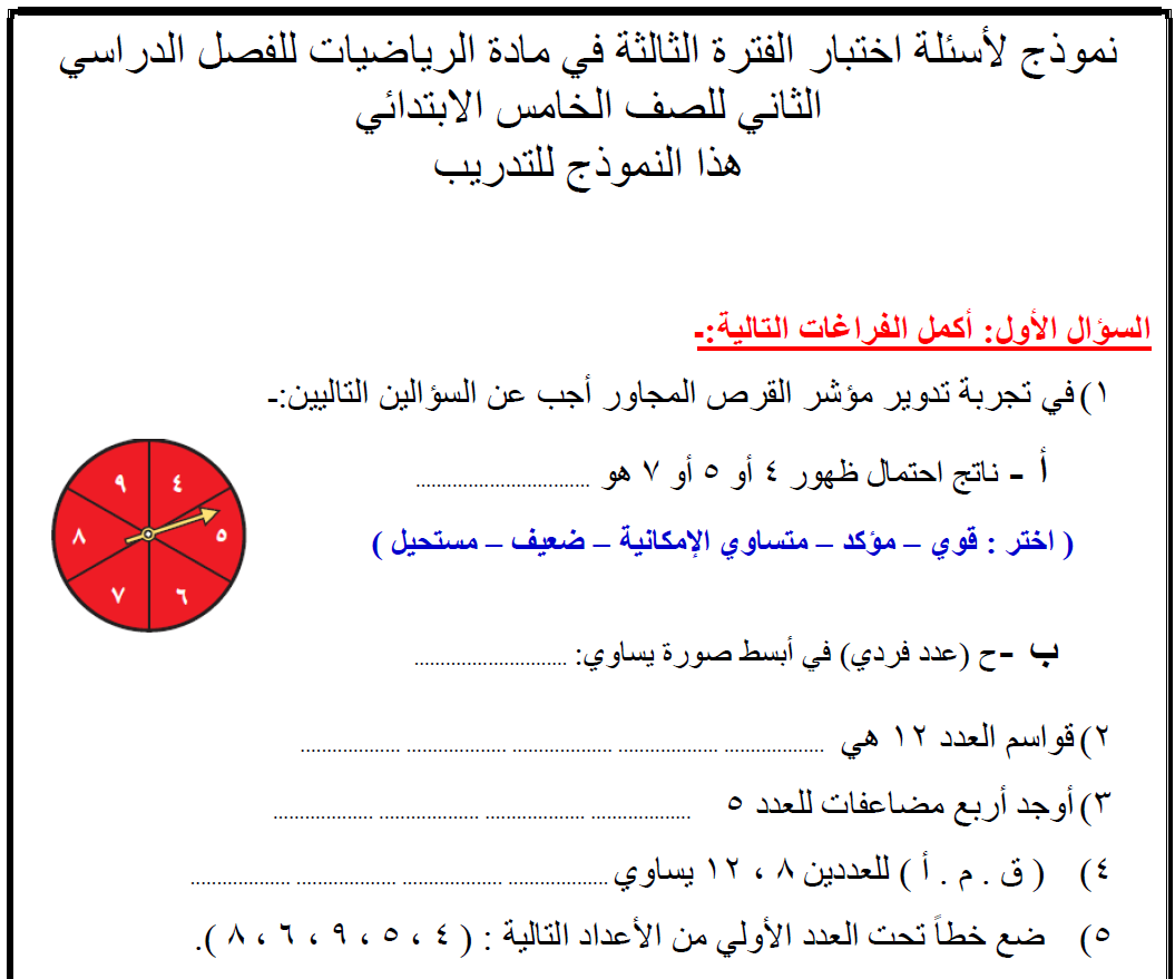 نماذج اسئلة اختبار رياضيات الفترة الرابعه خامس ابتدائى الفصل ثاني