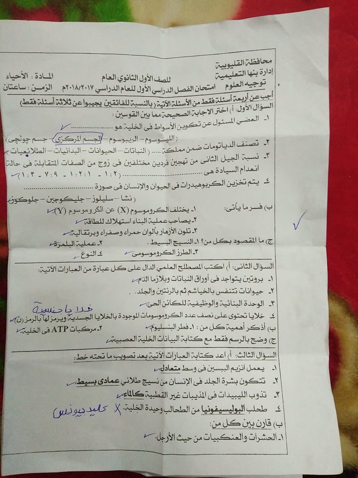 صدى البلد معلمة تنشر صورا من امتحان أحياء أولى ثانوي عبر فيس بوك