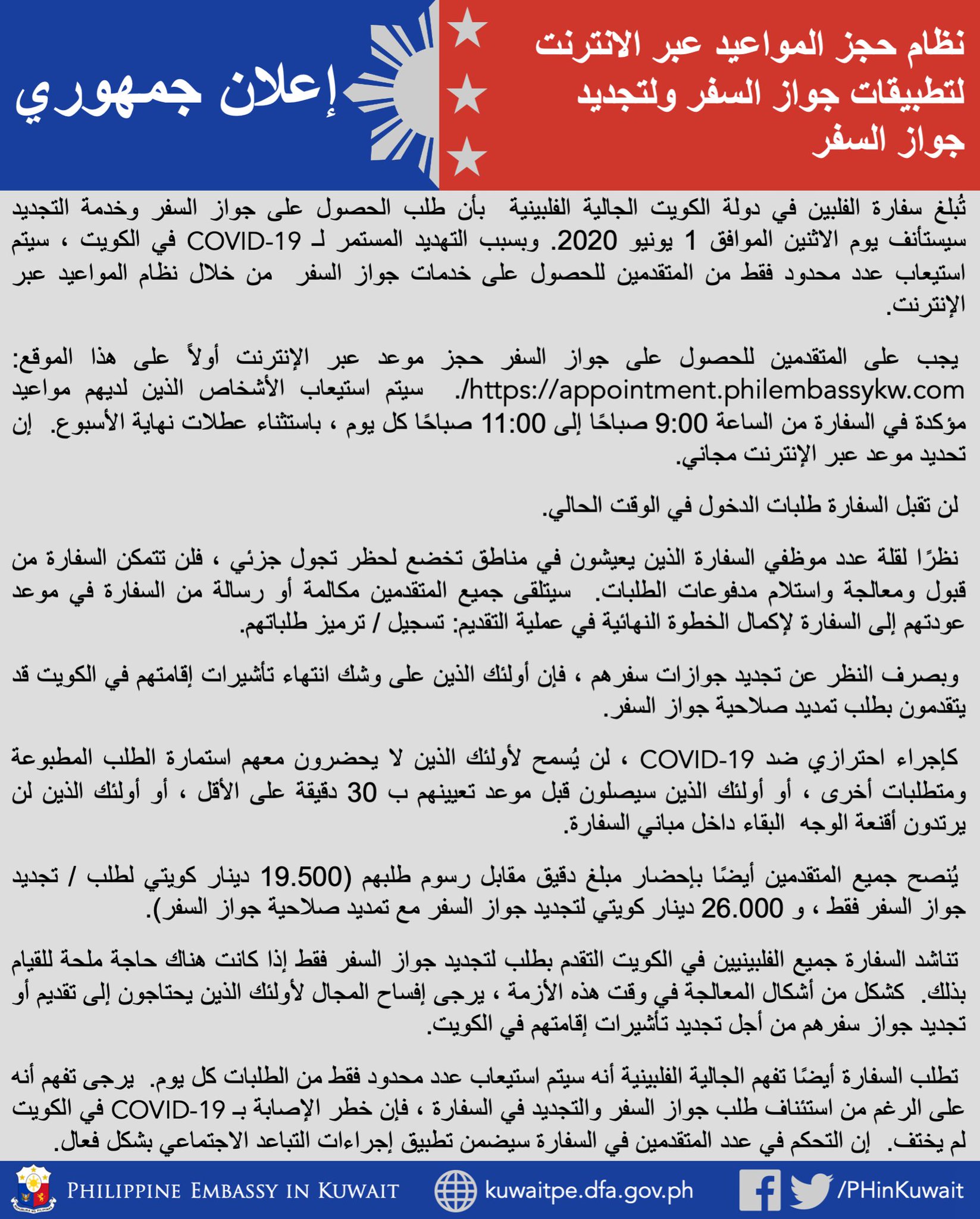 Philippine Embassy In Kuwait On Twitter إعلان جمهوري نظام حجز المواعيد عبر الانترنت لتطبيقات جواز السفر ولتجديد جواز السفر Https T Co Oql3lxwl5e Covid19 Safereopening Newnormal Phinkuwait Https T Co Rzvxxcprsz