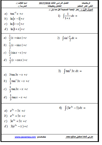 نموذج اختبار الكتروني 1 اختيار من متعدد لمادة الرياضيات الصف الثاني عشر الفصل الثالث 2018 منتديات صقر الجنوب
