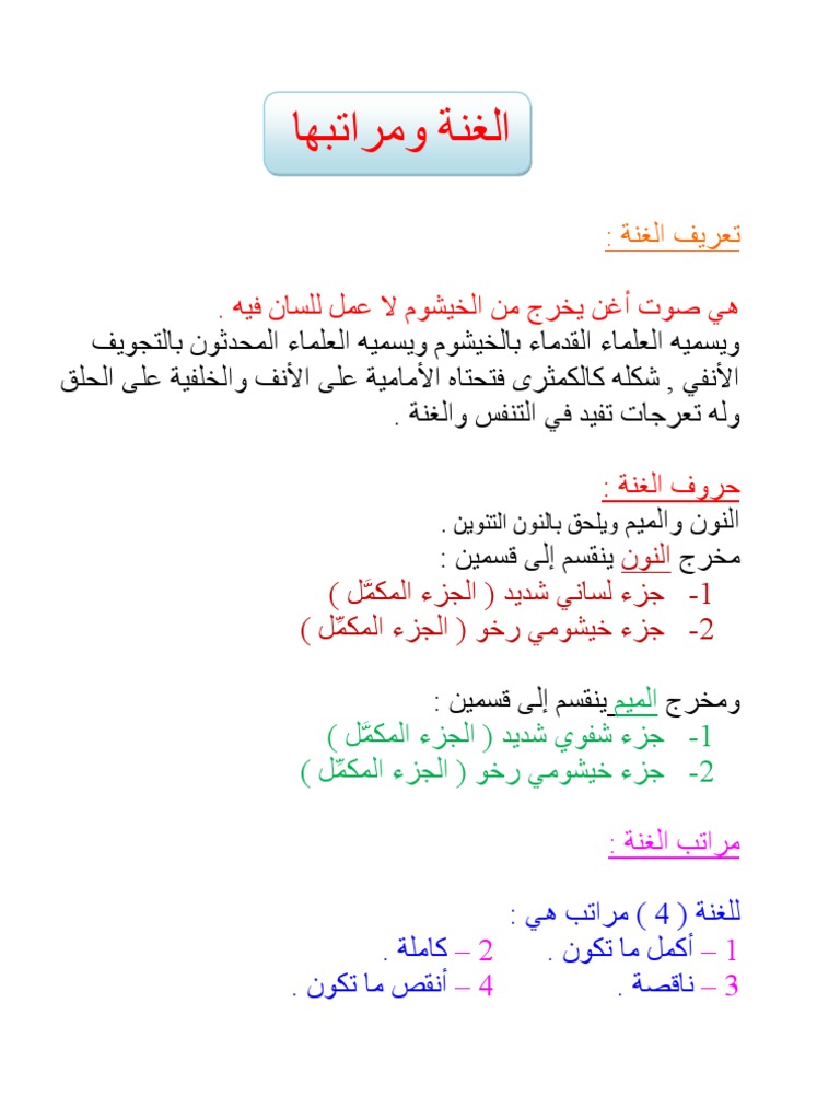 هل اللطف موجود في جيناتنا أحكام التجويد. تعريف الغنة لغة واصطلاحا ما هي الغنة أما بعد فالغنة لغة صوت له رنين في الخيشوم وفي اصطلاح علماء التجويد صوت خفيف يخرج من الخيشوم ولا عمل فيه للسان وتمد الغنة بمقدار حركتين والحركة هي بمقدار ما يقبض الإنسان إصبعه أو. اختلف العلماء في عدد مراتب الغنة في التجويد فقس مها بعضهم إلى ثلاثة مراتب فقط وبعضهم إلى أربعة أما البعض الآخر فزاد عليها لت صبح خمس مراتب على النحو التالي. نون وميم مخفاه القلب.
