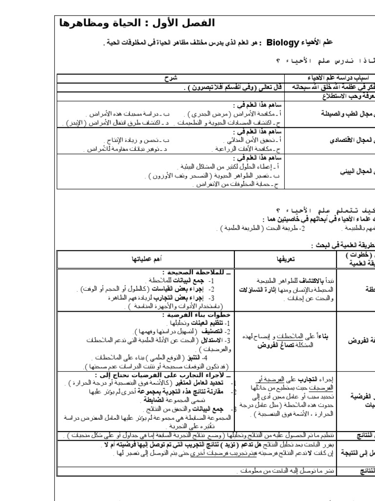 ملخص الاحياء اول ثانوي الفصل الاول