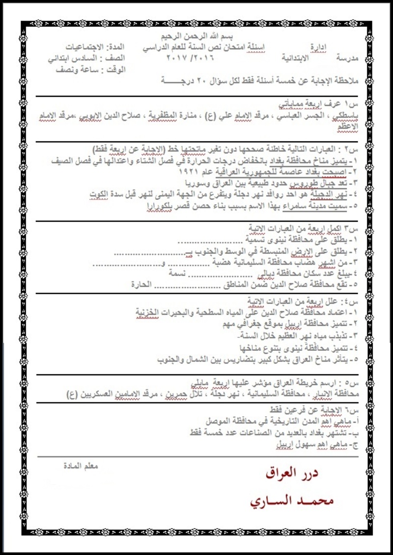 نموذج أسئلة أمتحان مادة الاجتماعيات نصف السنة الصف السادس ابتدائي 2017